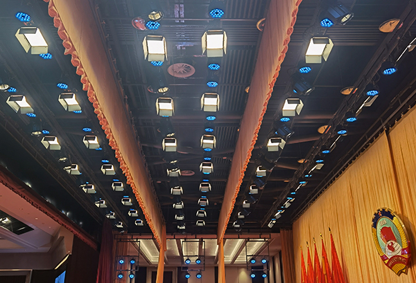 • 通用舞臺承建江蘇某學院報告廳項目,涵蓋舞臺燈光、電動吊桿、阻燃幕布等核心設備的設計與安裝